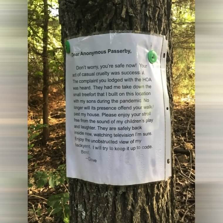 It seems that a neighbor who isn't very pleasant complained to the municipal about the illegal building of a treehouse. And on top of that, it was during a pandemic. That's too bad.