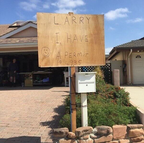 Has anyone ever had a neighbor who always and continually pushes their nose into your business? The man in the image below has. He knew that if he wanted to perform some work on the driveway, Larry would talk to him. He put up this sign instead to avoid having to deal with Larry: "Larry, I have a permit." Now, Larry will have to check with the city council before he can come back and snoop some more.