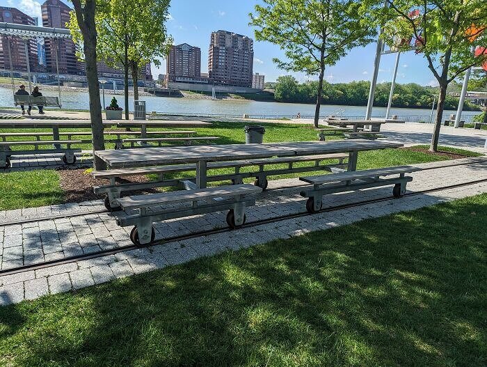 Do you ever feel awful about taking a table that's too big for your group? It's the only one available, so you have to take the bigger one. This is where the picnic tables in Smale Riverfront Park in downtown Cincinnati really shine! These tables are on top of old streetcar tracks. That manner, people may quickly push the tables together or pull them away as needed.