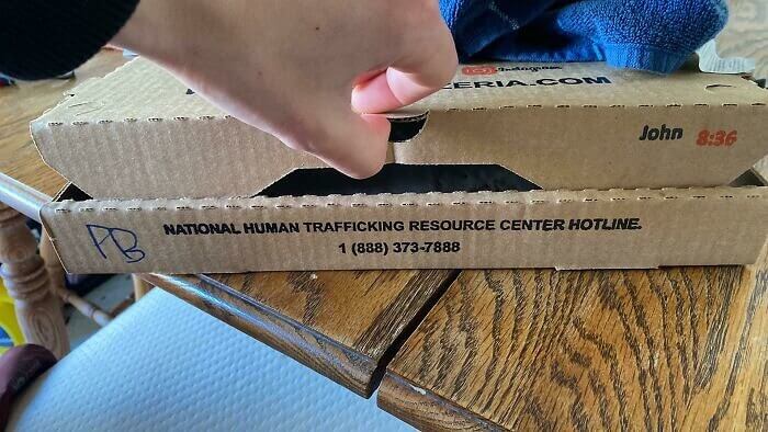 What a great idea! It's awful, but human trafficking is a big problem all around the world, and victims often don't know where to go for help. Putting the number for the national human trafficking resource hotline on pizza boxes (like the one in this picture) and other household objects, on the other hand, makes it more likely that victims of trafficking will be able to get the aid they need. It looks like there is also a bible verse on the box: