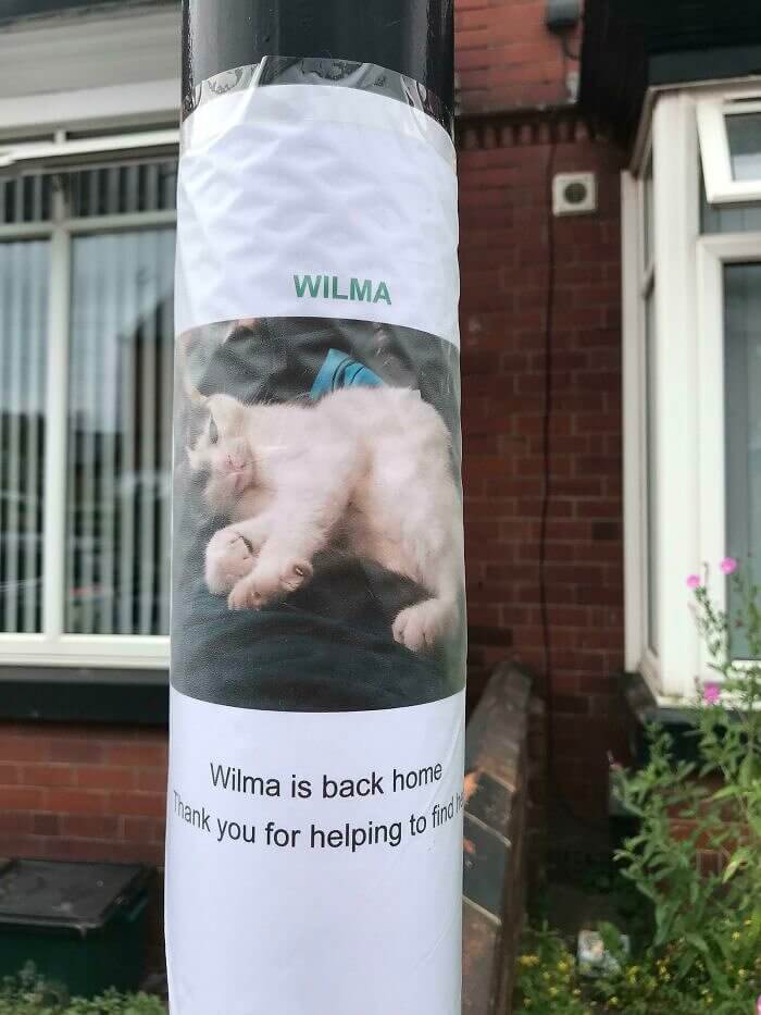 Well, in this case, you'll be happy to know that the owner of the lost cat put up follow-up flyers where the "missing" posters had been so that everyone would know the happy ending!