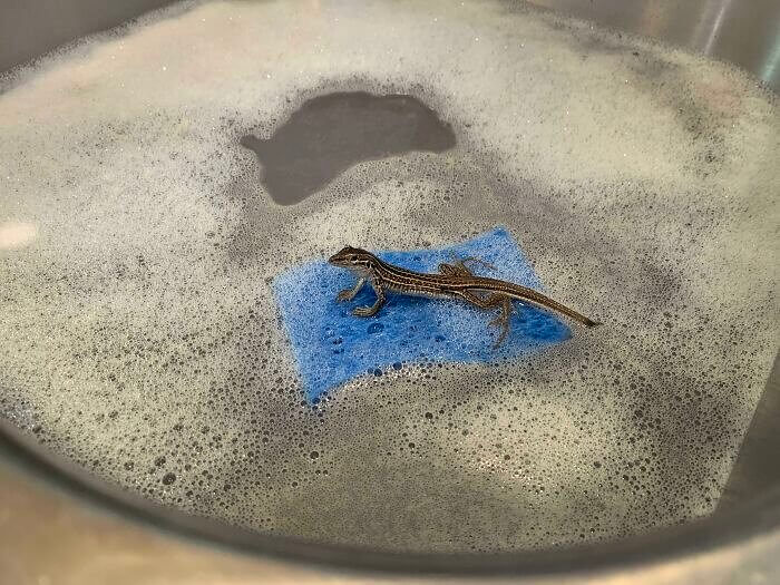 Have you ever seen a lizard in a kitchen sink using a sponge as a raft? If you haven't, now you have! We can probably agree that a lizard is one of the last things you want to see in your laundry. But it might be worth noting that the person who sent the original message was from Mexico. We can't help but wonder whether this happens a lot over there.