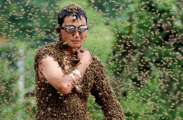 If bees fear you, don't look now! Every year, beekeepers in China compete in a bee bearding contest to see who can cover their body with the most honeybees. The festival usually happens at Shaoyang, which is in the Hunan province of China. People say it's a method for the beekeeper to show off their ability and bravery. The one who can stand the most bees crawling all over them wins the contest.